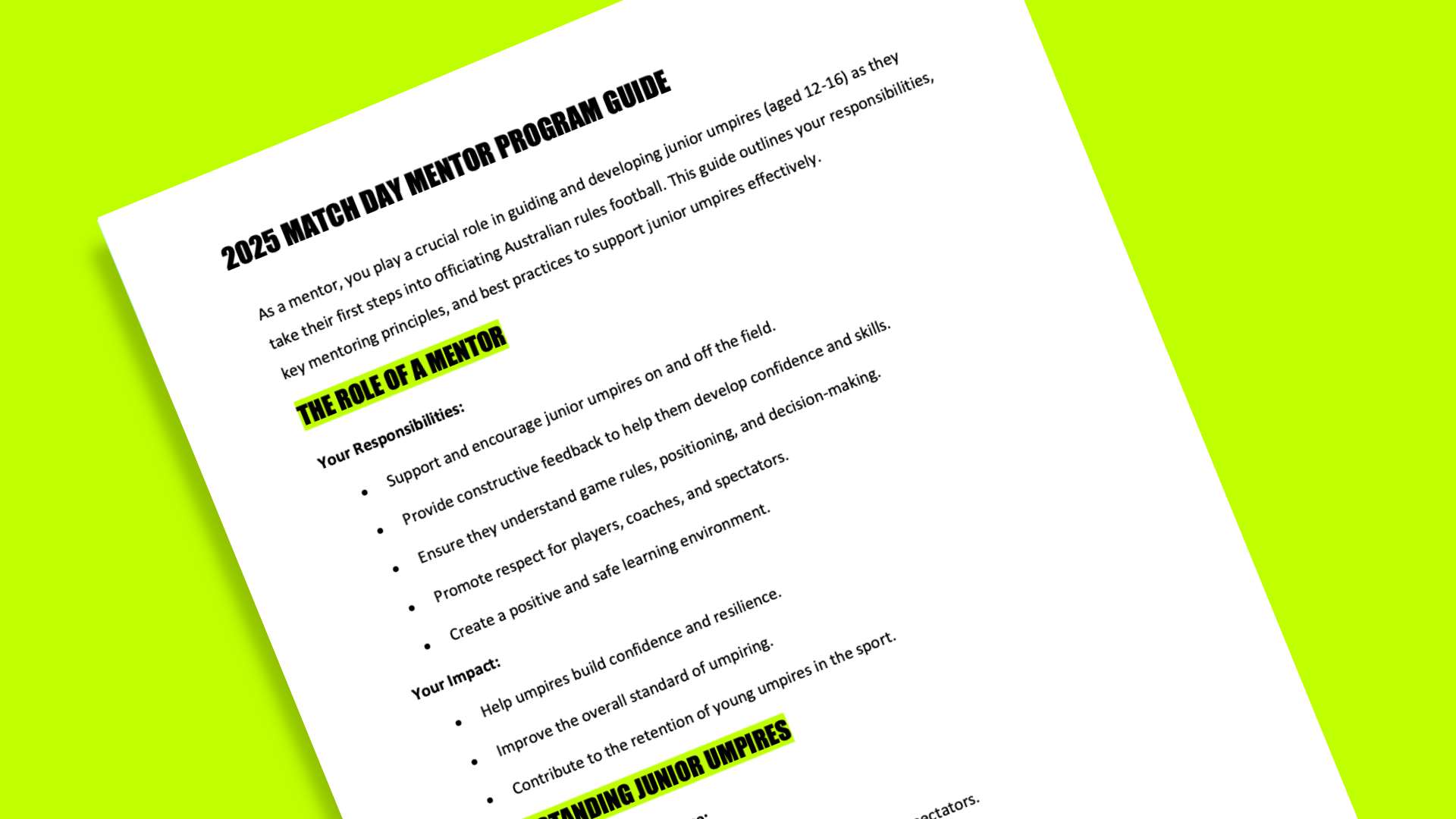 As a mentor, you play a crucial role in guiding and developing junior umpires (aged 12-16) as they take their first steps into officiating Australian rules football. This guide outlines your responsibilities, key mentoring principles, and best practices to support junior umpires effectively.