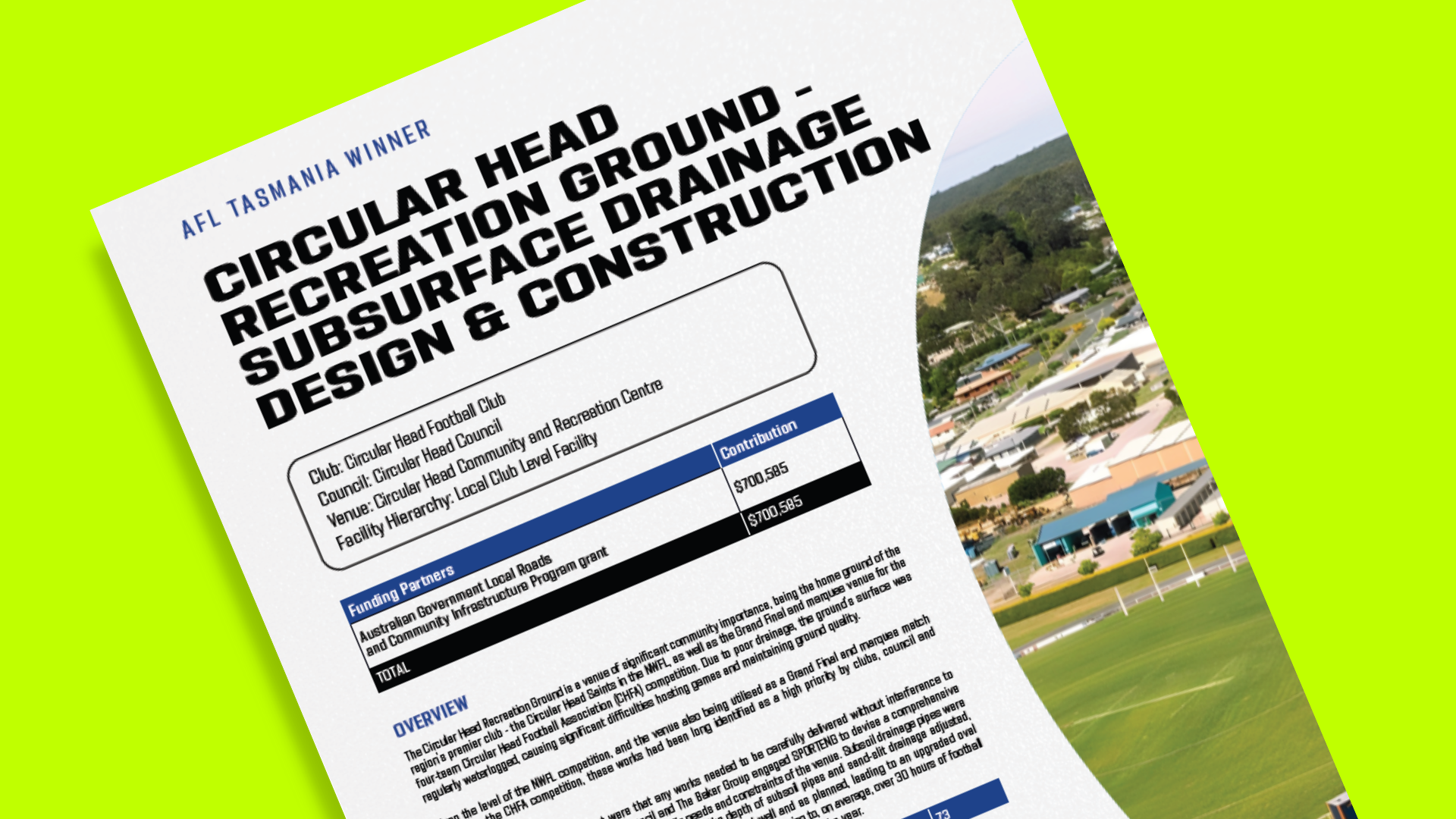 The Circular Head Recreation Ground is a venue of significant community importance, Due to poor drainage, the ground’s surface was regularly waterlogged, causing significant difficulties hosting games and maintaining ground quality.