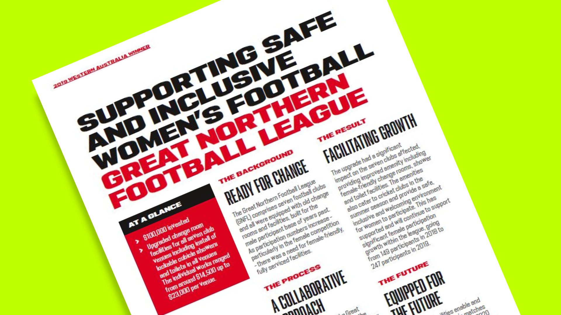 The upgrade had a significant impact on the seven clubs affected, providing improved amenity including female-friendly change rooms, shower and toilet facilities.