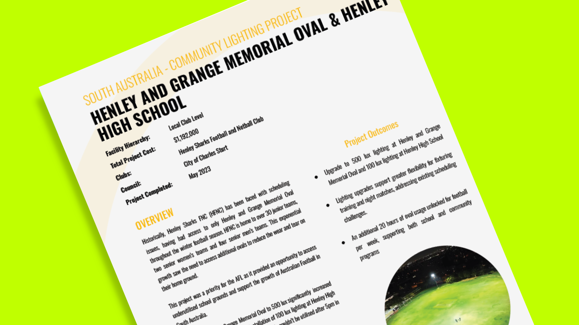 Update to 500 lux lighting at Henley and Grange Memorial Oval and 100 lux lighting at Henley High School.