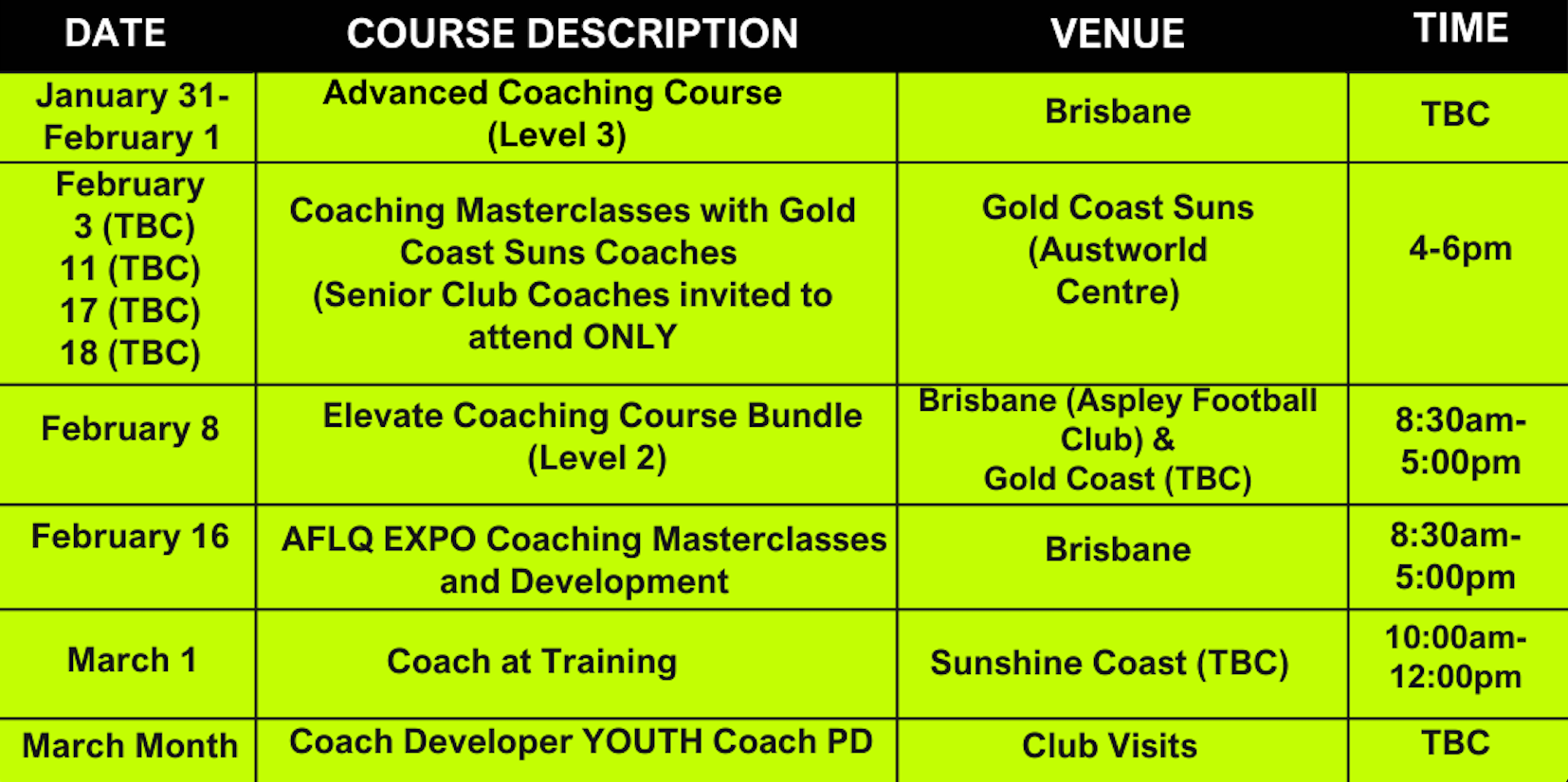 For details on any other coach education and development courses listed, please get in touch with AFL Queensland Coaching Development & Education Leads: Jack Barry (Brisbane) jack.barry@afl.com.au or Brad Moore (Gold Coast/Northern Rivers) brad.moore@afl.com.au