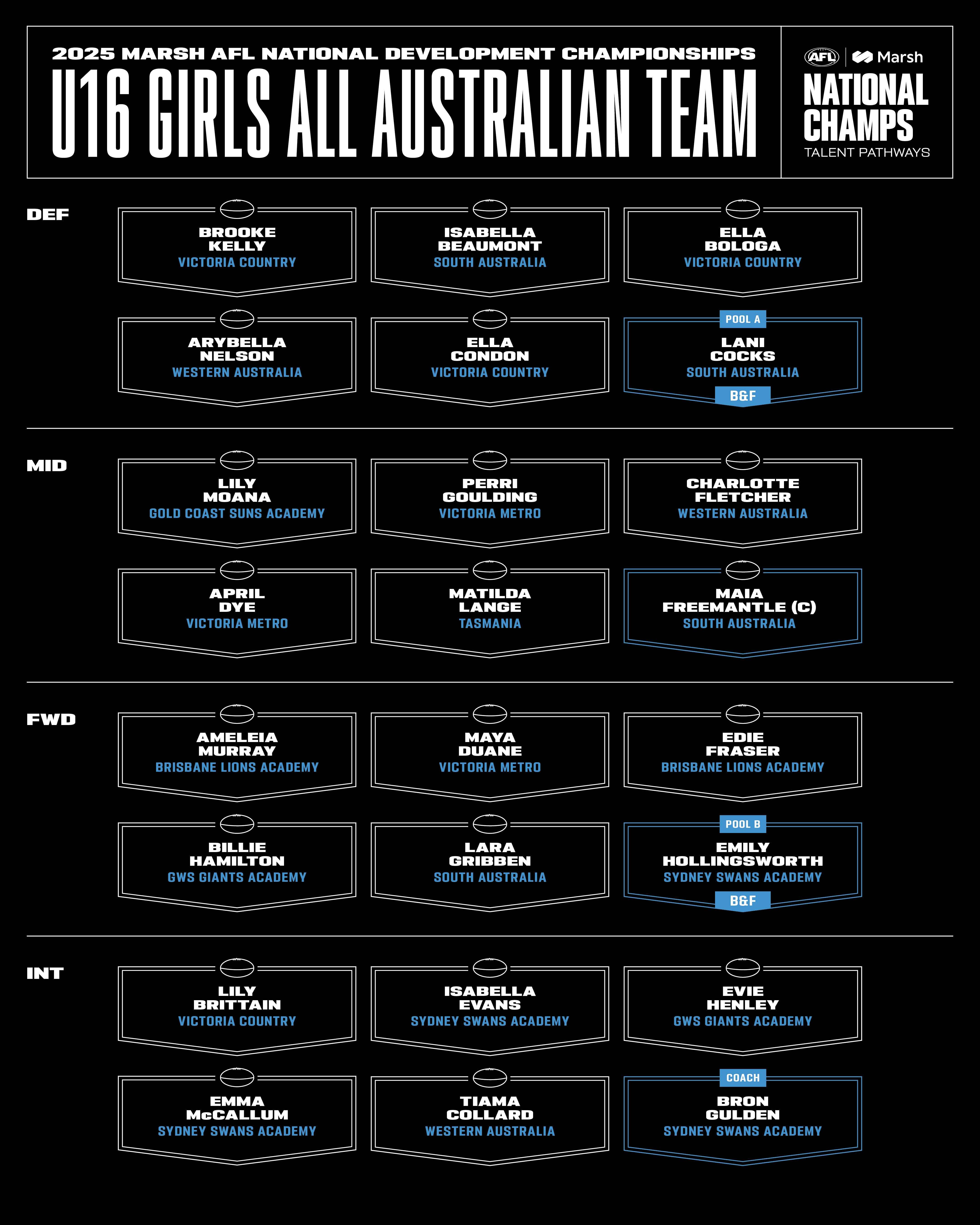 Continue below to view the 2025 Marsh AFL National Development Championships – U16 Girls All Australian Team. Please click here to read profiles on each player, compiled by Kevin Sheehan.