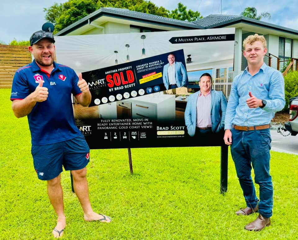 Image: Ben Woodburn with Surfers Paradise leadership, in front of a sold property by Smart Real Estate.