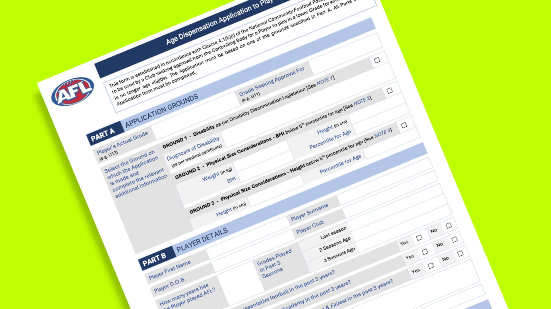 A player may apply for dispensation to play in a competition below their eligible age group, in accordance with the AFL National Age Dispensation Policy.