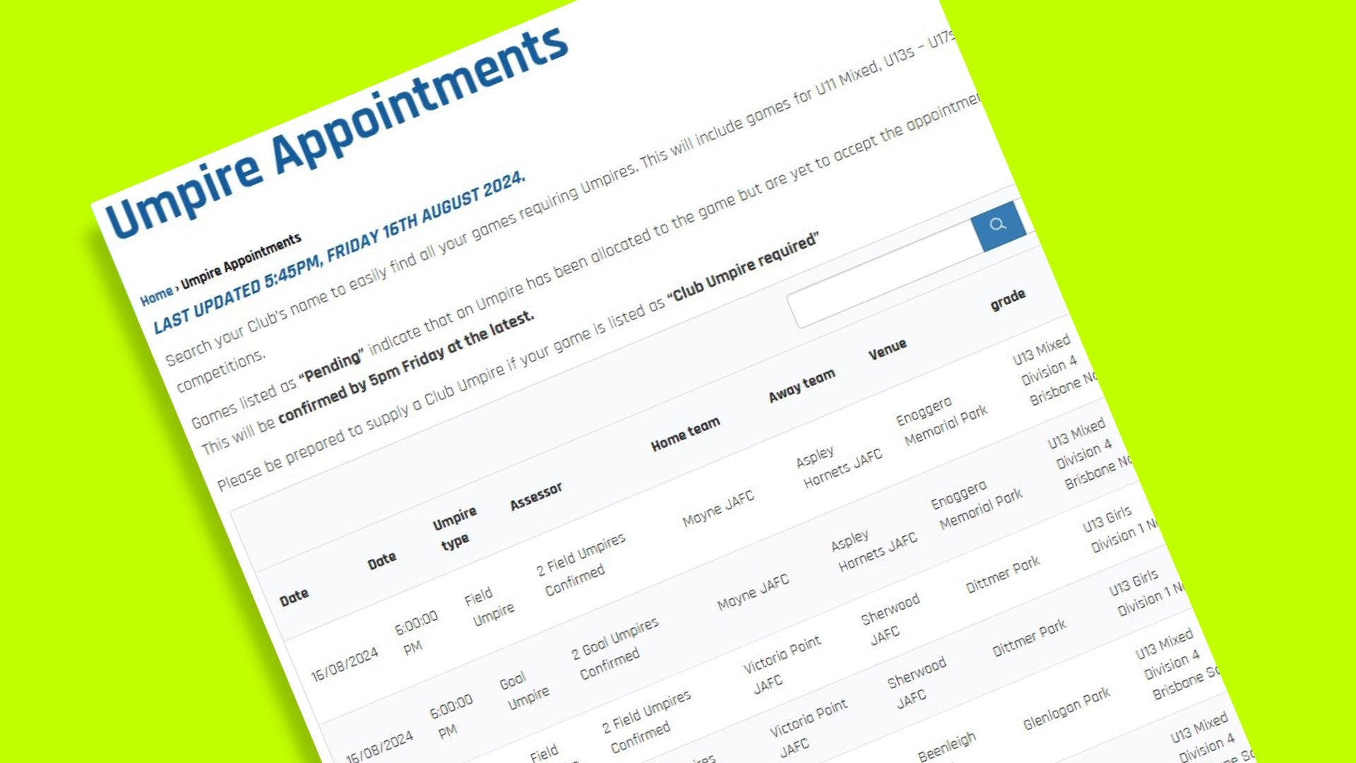 Umpire Appointments for all SEQ Junior Games each weekend.