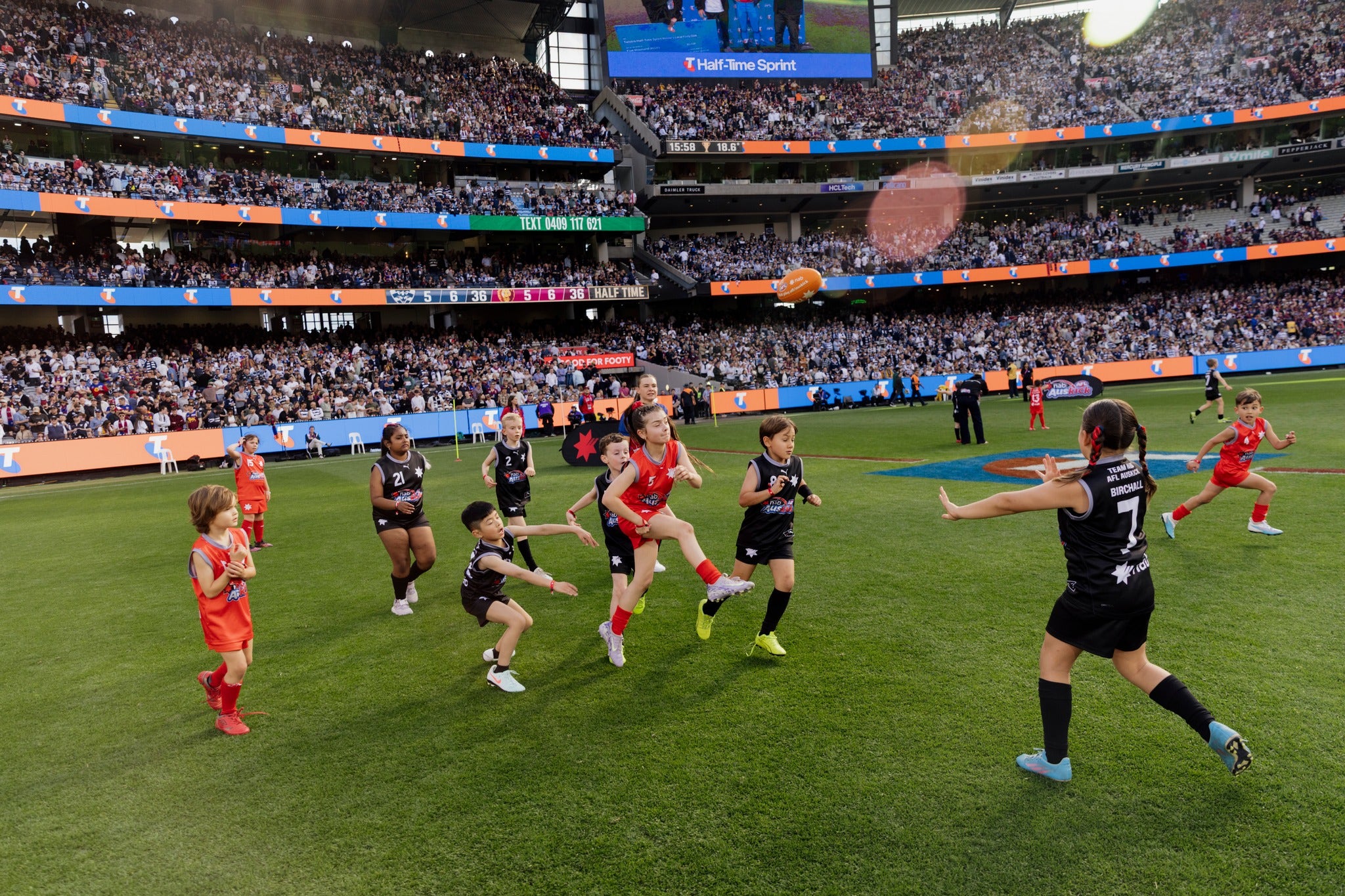 Allira Gattellaro and her brother Raff at half-time Auskick on the MCG during the 2025 Toyota AFL Grand Final.
