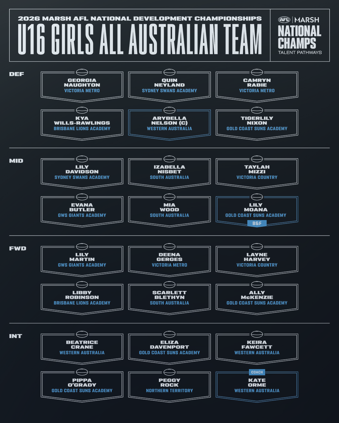 The 2026 Marsh AFL National Development Championships U16 Girls have concluded, with team MVPs and a 23-person All Australian team named.